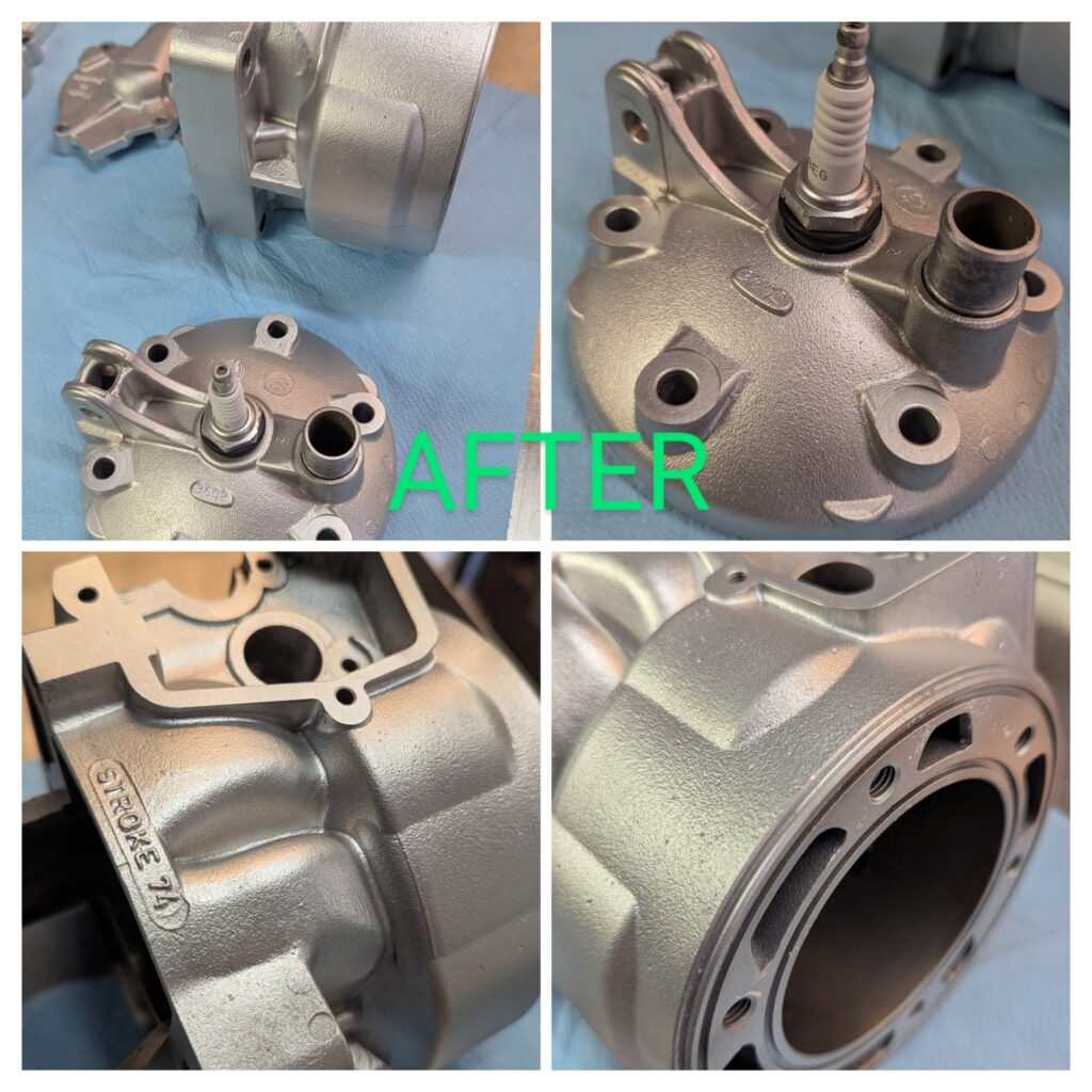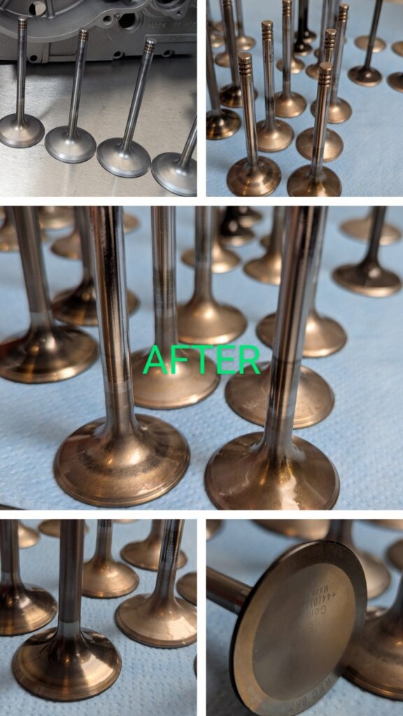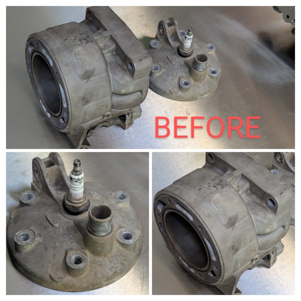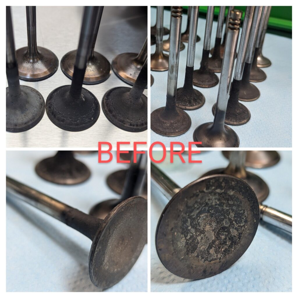 Før- og efter-billederne taler for sig selv – ventiler, topstykker og bremsekomponenter går fra at være dækket af snavs og belægninger til at stå skinnende rene og klar til brug igen.